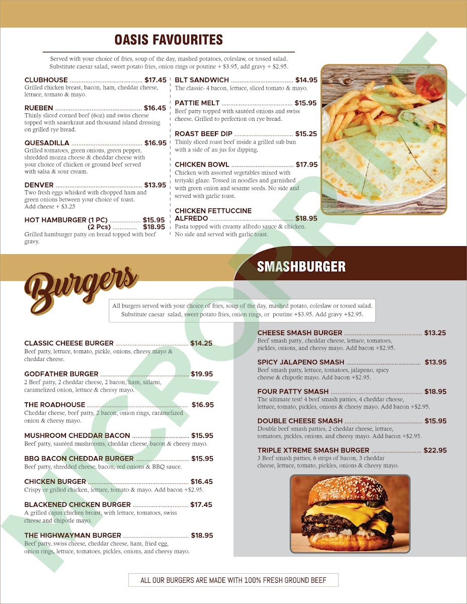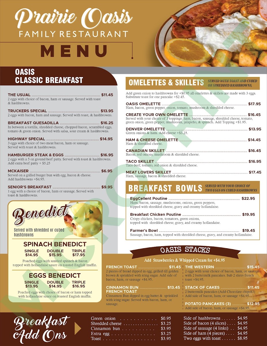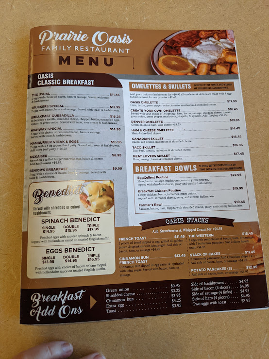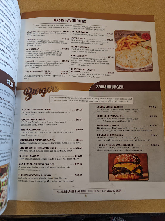 From a reviewer’s perspective, the menu at Prairie Oasis Family Restaurant offers a wide, comforting selection that covers everything from hearty breakfasts to satisfying dinners. The appetizer section features crowd-pleasers like Chicken Wings (8 Pcs), Chicken Fingers (4 Pcs), and Breaded Pickle Chips (8 Oz), along with classic Fries and Poutine. House specialties such as the Patty Melt, Clubhouse, Denver, Chicken Fettuccine Alfredo, and Reuben provide familiar diner-style comfort, while breakfast lovers can enjoy generous plates like the Highway Special, Senior's Breakfast, Truckers Special, Breakfast Quesadilla, and Hamburger Steak And Eggs. The burger lineup is particularly appealing, including the Cheese Smash Burger, Triple Xtreme Smash Burger, Spicy Jalapeño Smash, Four Patty Smash, and Double Cheese Smash, alongside favorites like the Classic Cheeseburger and BBQ Bacon Cheddar Burger. There are also lighter options such as Taco Salad, Cobb Salad, Chef's Salad, and Chicken Caesar Salad, plus hearty entrées like Roast Beef Dinner and Creamy Mushroom Chicken (2 Pcs). To finish, desserts like Strawberry Champagne Cheesecake, Carrot Cake, and Chocolate Extravaganza Cake make the menu feel complete. Overall, the menu emphasizes generous portions, classic comfort dishes, and a family-friendly variety that makes it easy for everyone to find something satisfying.